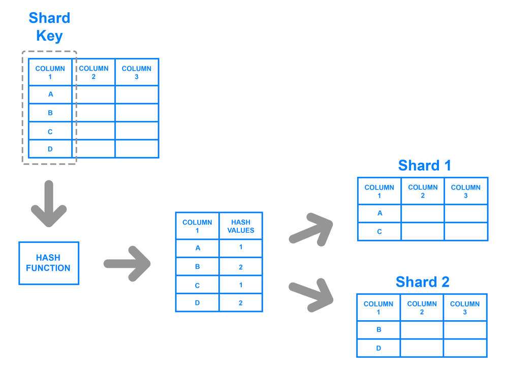 1) 샤드 키 컬럼을 선택합니다 → 2) 해시 함수를 적용합니다 → 3) 같은 해시 값은 같은 샤드로 배치됩니다.
