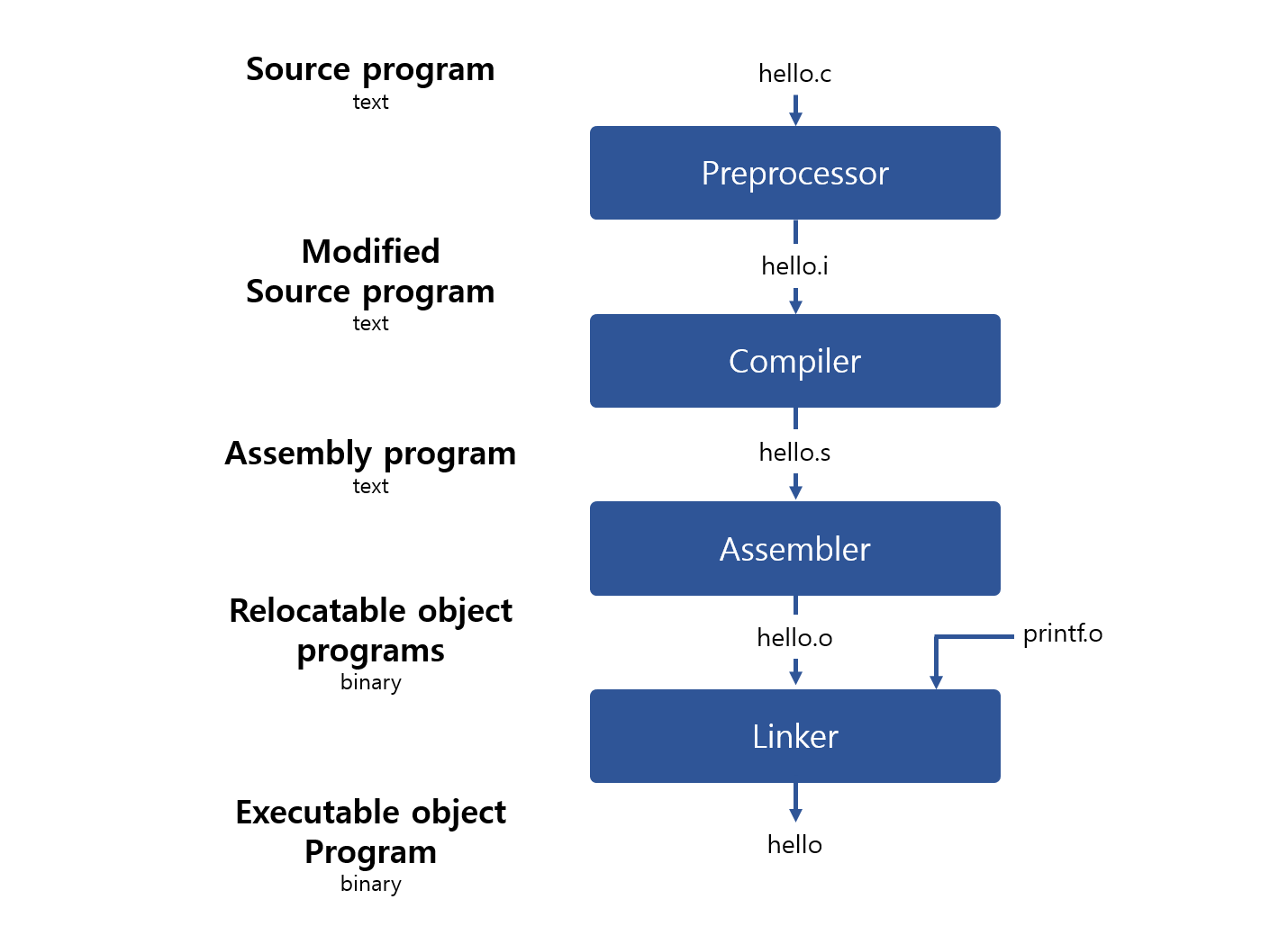 Compiler(컴파일 단계): 텍스트파일(hello.i)을 텍스트파일(hello.s)로 번역한다. 이 파일에는 어셈블리어 프로그램이 저장된다. (어셈블리어( assembly language )는 기계어와 일대일 대응이 되는 컴퓨터 프로그래밍의 저급 언어)