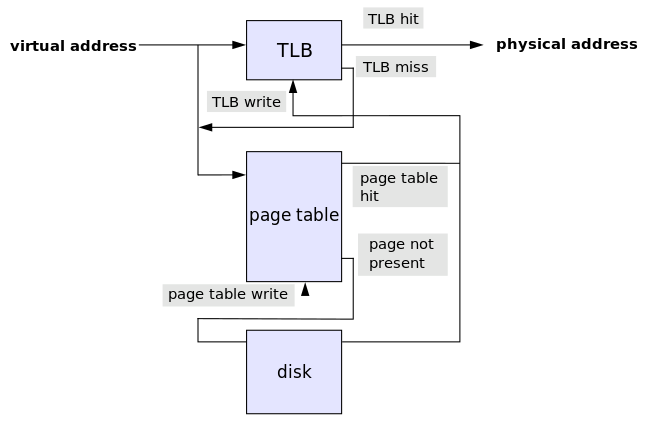TLB에는 가장 최근에 사용된 페이지 테이블 항목이 포함되어 있습니다. 가상 주소가 주어지면 프로세서는 TLB를 검사하여 페이지 테이블 항목이 있는지 확인하고(TLB 히트), 프레임 번호를 검색하여 실제 주소를 형성합니다. TLB에 페이지 테이블 항목이 없는 경우(TLB 미스), 페이지 테이블을 처리하는 동안 페이지 번호가 인덱스로 사용됩니다. TLB는 먼저 페이지가 메인 메모리에 이미 있는지 확인하고, 메인 메모리에 없으면 페이지 오류가 발생하면 새 페이지 항목을 포함하도록 TLB를 업데이트합니다.
